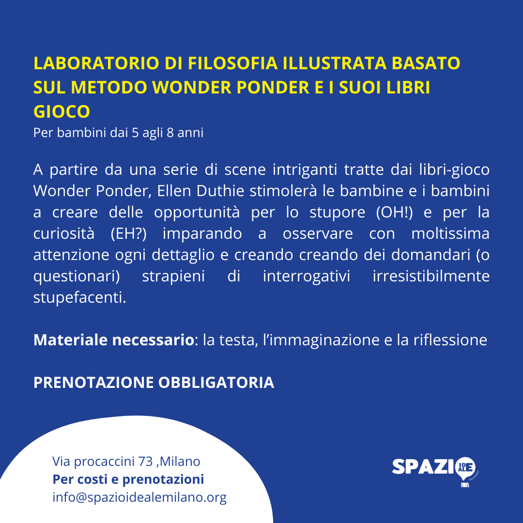 Venerdì 15 novembre Ellen Duthie, scrittrice, insegnante, blogger, traduttrice specializzata in letteratura per l’infanzia e filosofia per bambini, e autrice dei concetti e dei testi WONDER PONDER, sarà ospite di Spazio Ideale per due laboratori di filosofia illustrata.