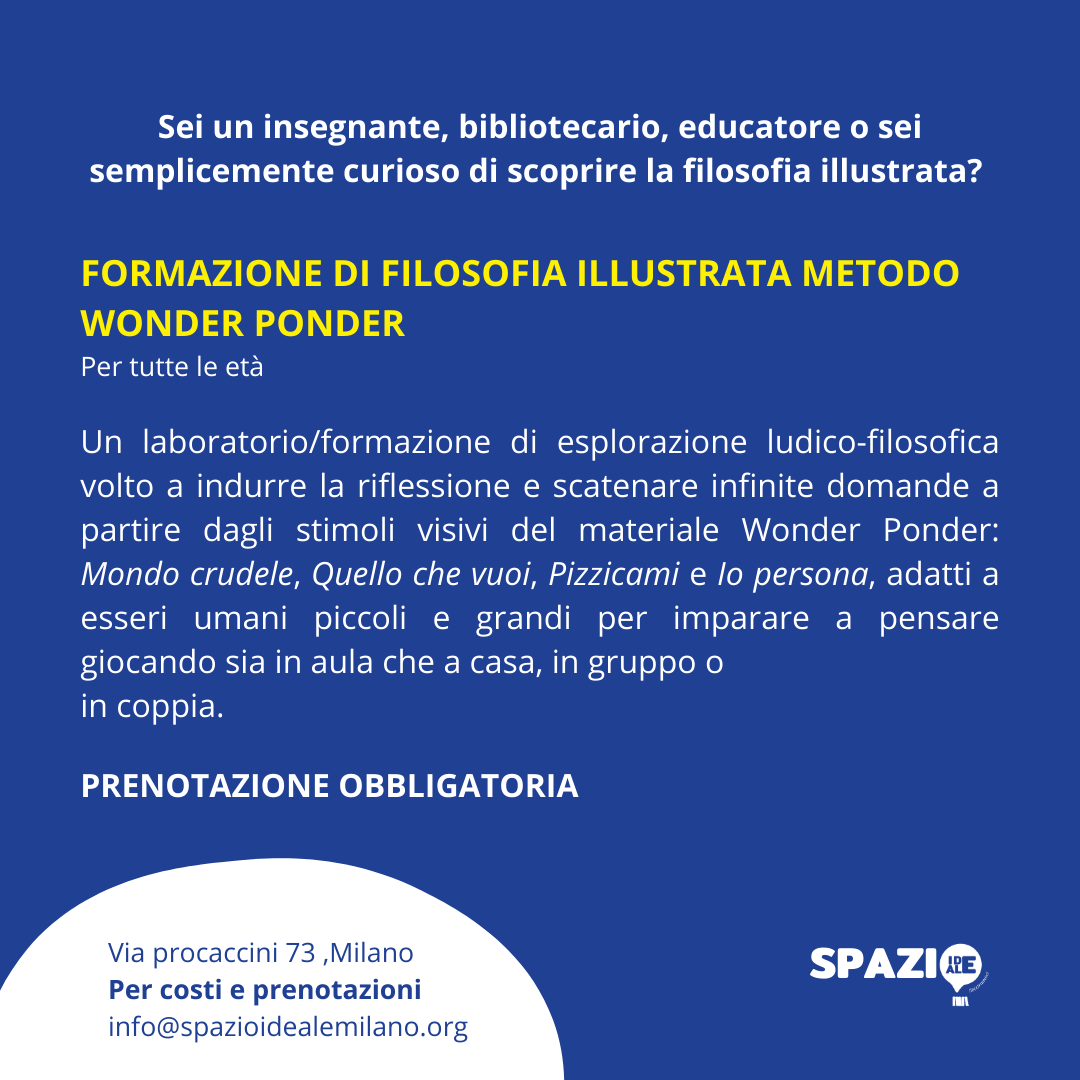 🌱 Se sei un’insegnante, bibliotecario, educatore o sei semplicemente curioso di scoprire la filosofia illustrata, dalle 20:30 si terrà una formazione di filosofia illustrata metodo Wonder Ponder aperto a tutte le età, durante il quale, attraverso l’esplorazione ludico-filosofica, verrà indotta la riflessione a partire da stimoli visivi del materiale Wonder Ponder.